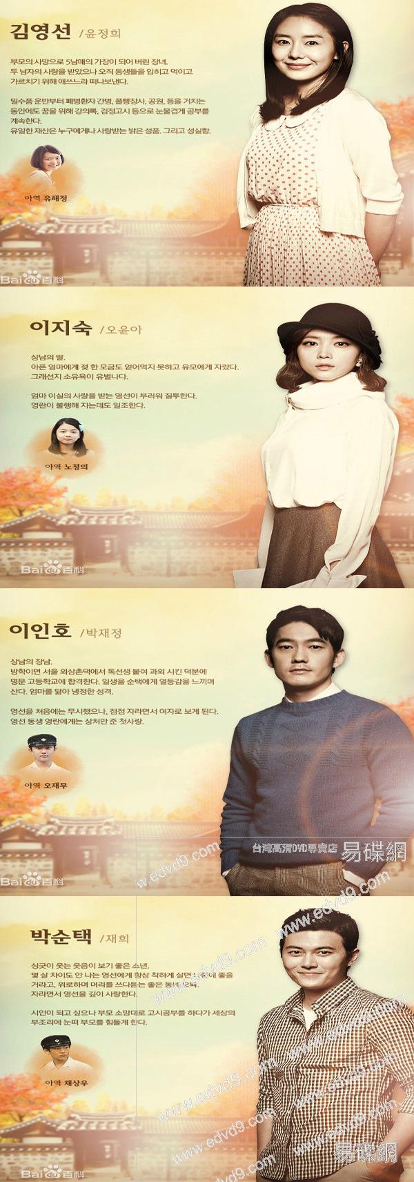 劇情簡介: JTBC即將於2013年9月播出的一部50集的以1960年為背景的周末劇,劇中講述在年紀很小的時候就失去父母的長女養大弟弟妹妹,成功的在社會上拼搏的故事。 貨到付款寄去臺灣本島, (如要寄去臺灣以外的地方,請先聯絡,我們會再報有關的郵費給你參考的,謝謝)