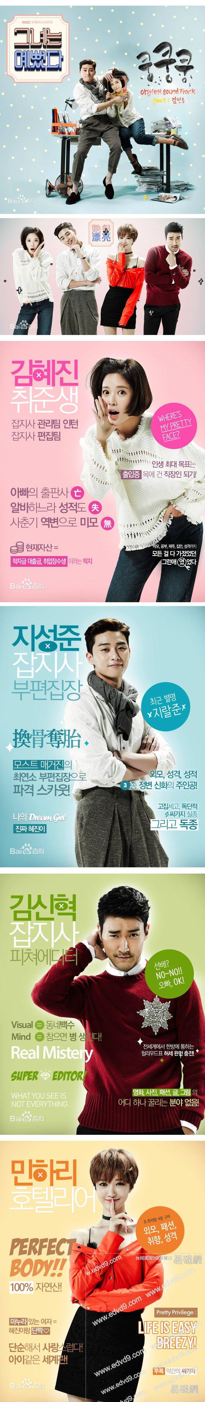 《她很漂亮》該劇講述過去擁有出衆美貌,長大後逆變成 “炸彈女” 的金惠珍(黃正音飾)和與其相反,送走年少時期正變成 “完美男” 的池晟俊(樸敘俊飾)之間尋找甜蜜、驚險隱藏著的初戀的浪漫愛情喜劇。金惠珍曾擁有美貌和財富,但長大後卻變得截然不同。如今是寄住在朋友家的寒酸小時工。有壹天,移民到海外的兒時朋友、初戀情人池晟俊提出與金惠珍見面。脫胎換骨的池晟俊沒能認出金惠珍,而金惠珍讓自己的朋友代自己赴約。後來金惠珍終于找到正式工作,在公司與依然認不出自己,只顧惡語傷人的冷漠美男子池晟俊重逢 。