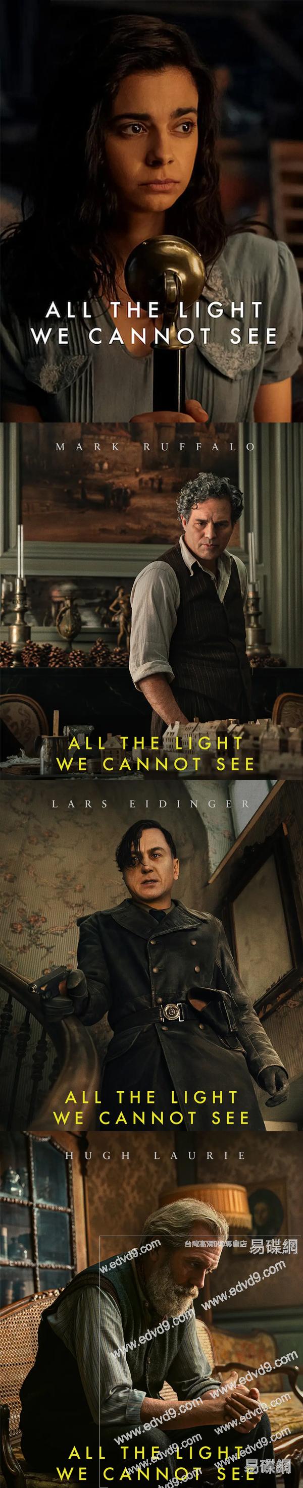 《所有我們看不見的光》巧妙地將瑪麗-洛爾和沃納十年間的生活交織在一起,這個故事講述了人際關系的非凡力量:這是一盞明燈,可以引領我們度過最黑暗的時代。這部四集的限定劇集由肖恩·利維執導,斯蒂文·奈特擔任編劇,新人演員阿麗雅·米婭·洛伯蒂和內爾·薩頓分別飾演老年時期和少年時期的瑪麗-洛爾,馬克·魯弗洛飾演丹尼爾·勒布朗,休·勞瑞飾演艾蒂安叔叔,路易斯·霍夫曼飾演沃納,拉斯·艾丁格飾演馮·倫佩爾,瑪麗昂·貝利飾演馬內克夫人。
